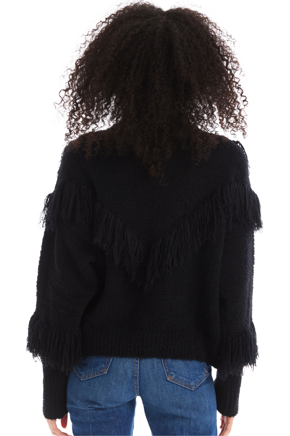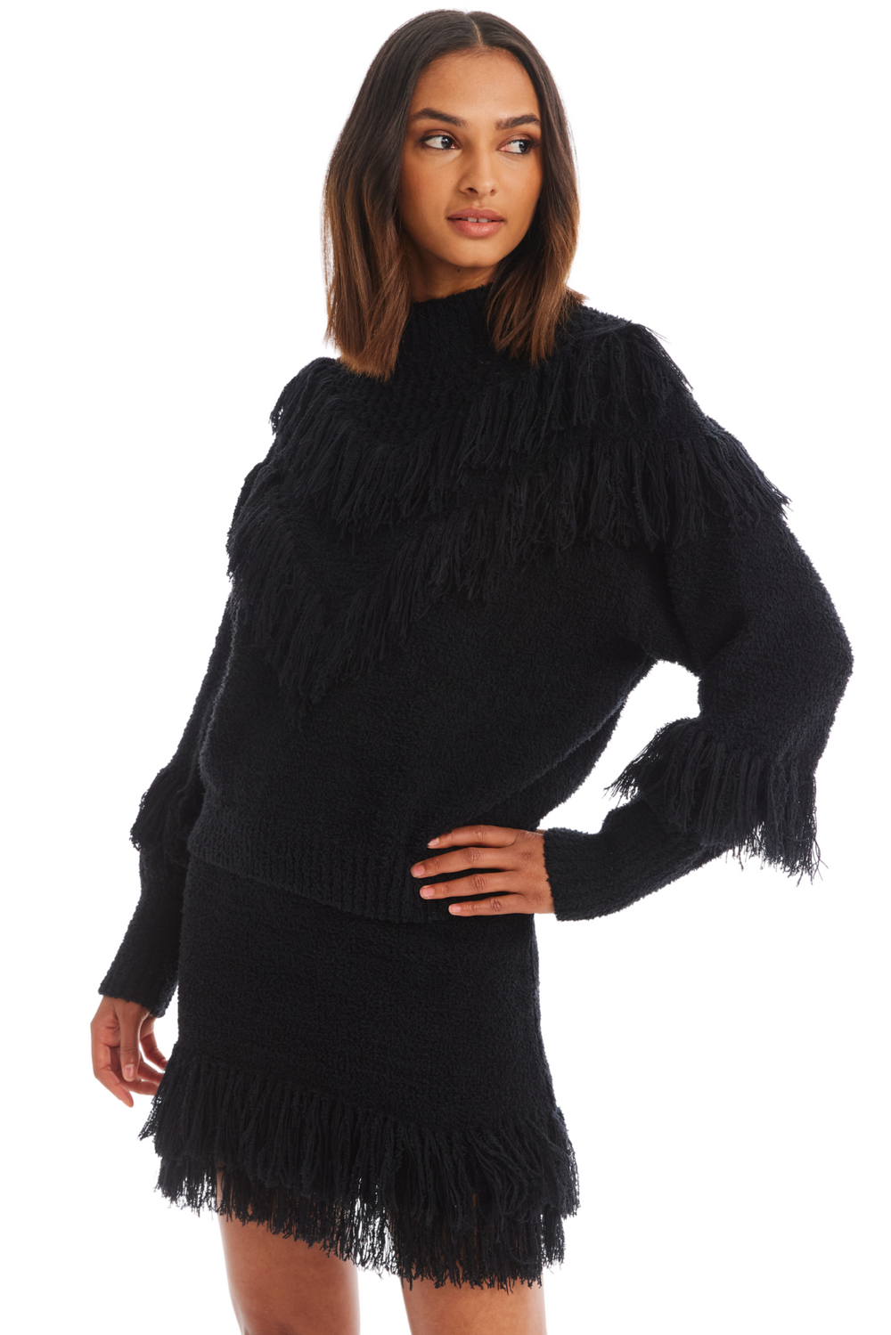 The Austin Sweater offers a bit of western flair with a fun fringe detail across the bodice. Designed in the coziest yarns with a high neck and dropped shoulder for a slouchy fit. The long sleeves are adorned with fringe and end in a ribbed cuff. Pairs perfectly with the matching Anna Skirt.
