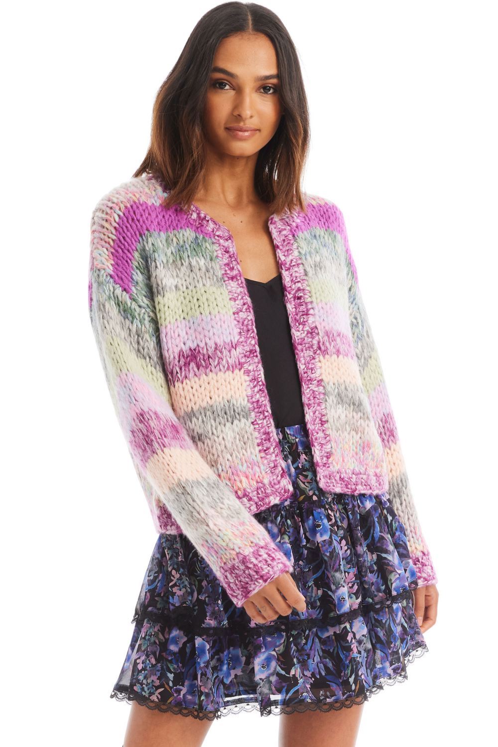 The colorful hand-knit Cropped Jodie instantly sparks joy! The perfect layering piece, this slouchy body has an open center front and long billowing sleeves. Boxy fit throughout.