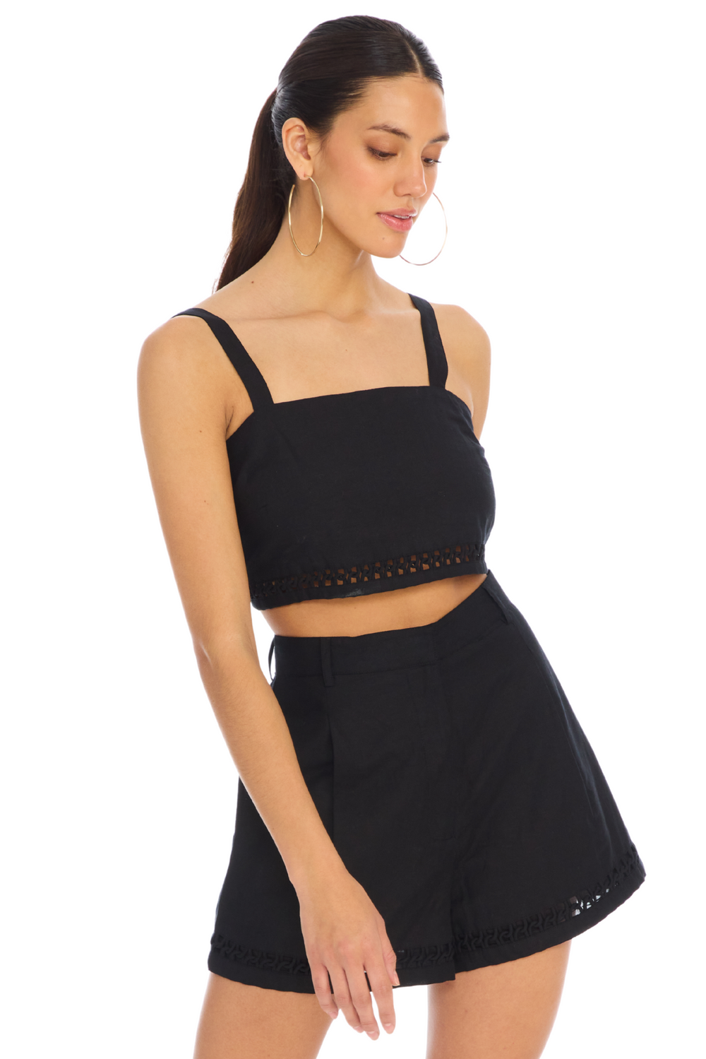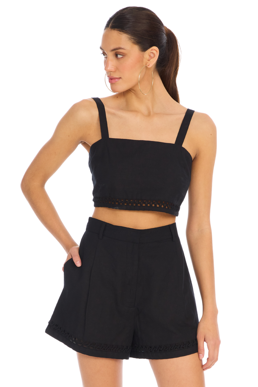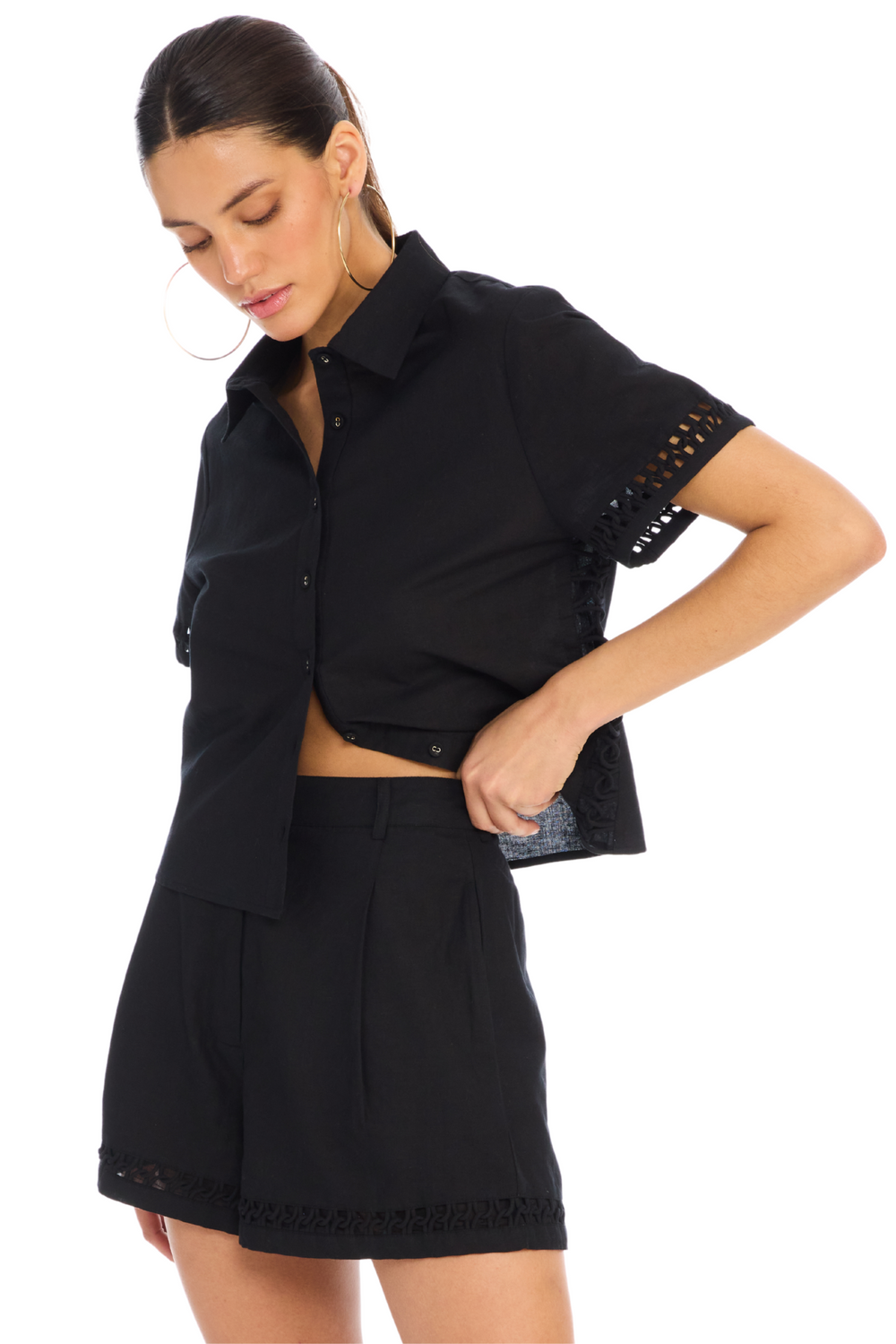A summer staple: The Elise Shorts are cut in a medium weight cotton/linen blend with a fixed waistband and button/zipper fly front closure. Designed with front pleats for a roomier leg and side pockets. Finished with an intricate basket-weave insert at the bottom hem and fully lined. We love these shorts paired back to the matching Camille and Elodie Tops.
