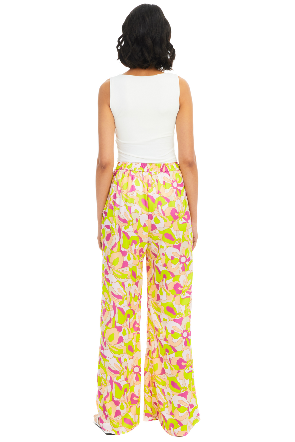 Bold and tropical; the Ira pants are a happy addition to our vacation wardrobe. Cut in a slinky satin fabrication in our exclusive Tropical Flowers Print. The easy pull on style features an elastic waistband and side pockets. Long flowy legs have a slight bottom flare. Unlined.