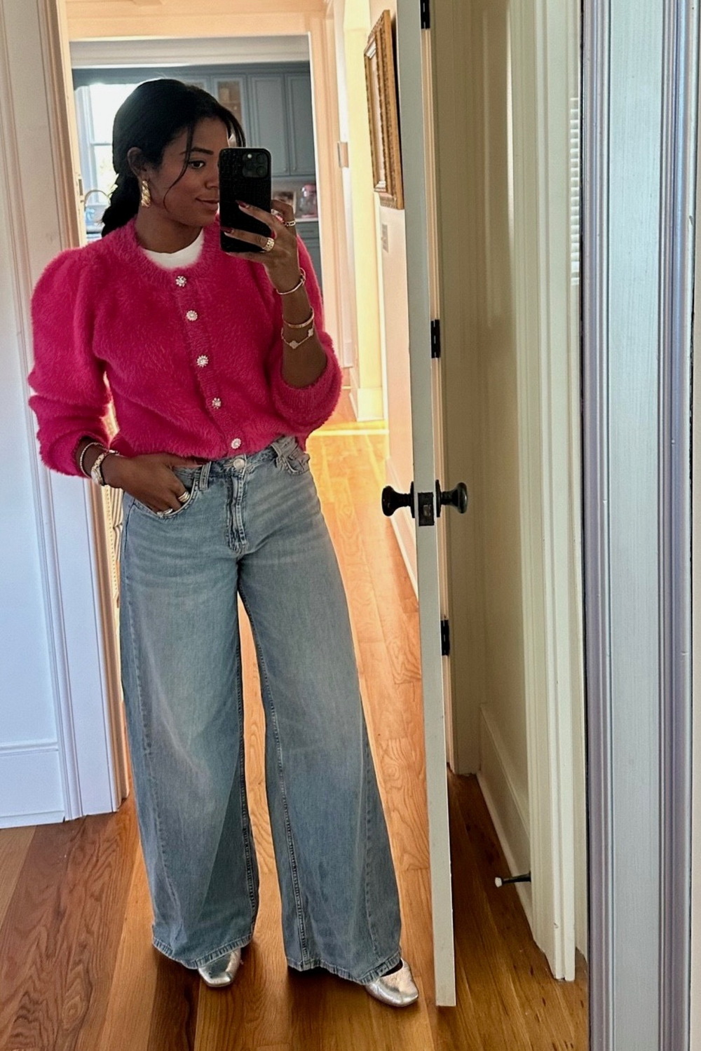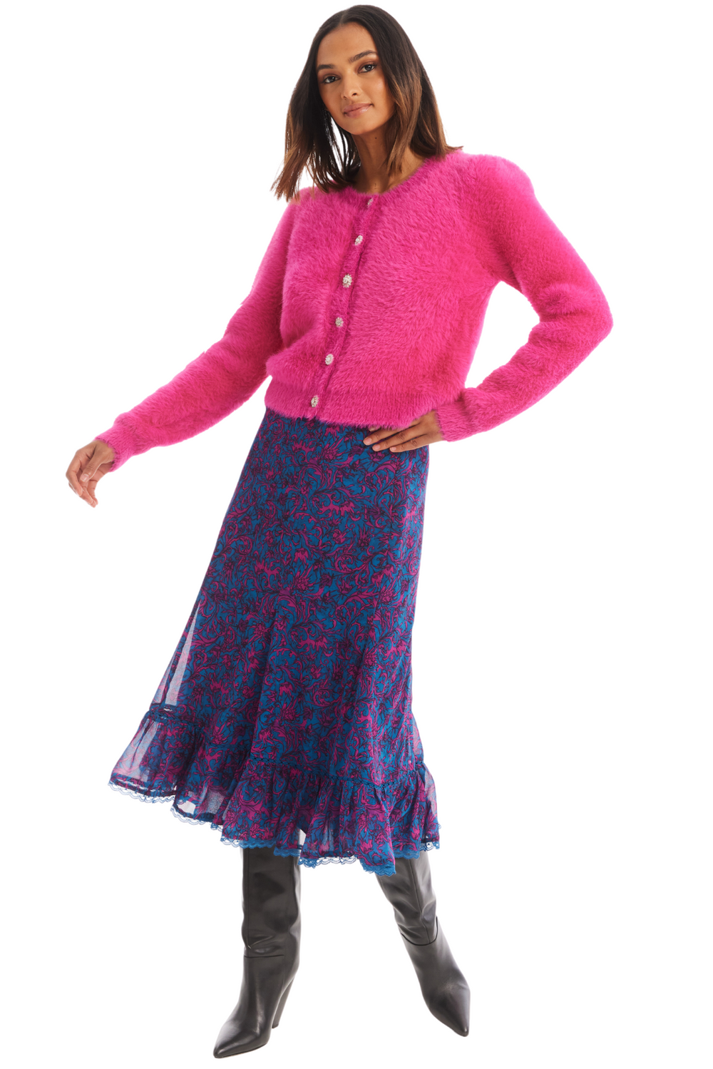 The Jeweled Sloan Cardigan is perfect for the romantic girl at heart! Designed in hot pink soft fuzzy yarns . Featuring working crystal buttons at the center front opening.