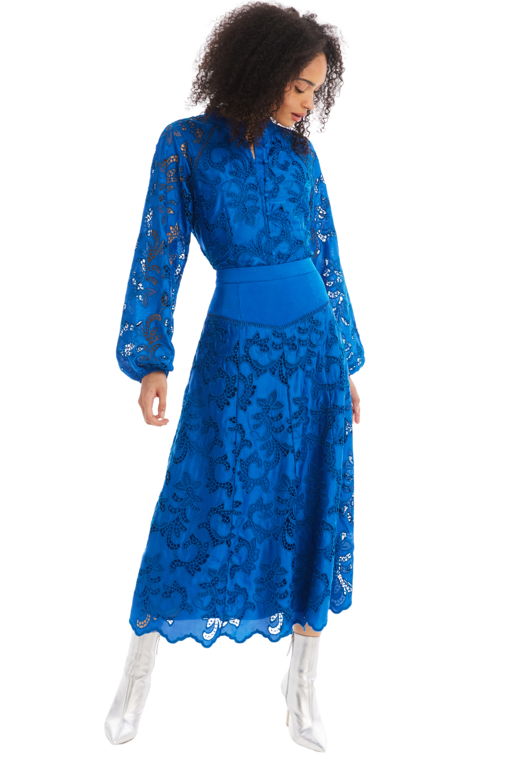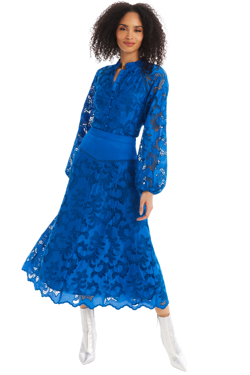 The Mila Midi Skirt is cut in our custom satin laser-cut fabrication with a scalloped hem. Featuring a fixed waistband and fitted hip panel. The A line style has a side zipper closure and is fully lined. Make it a matching set with the Adeline Blouse or throw on a slouchy sweater for a cozy fall vibe.
