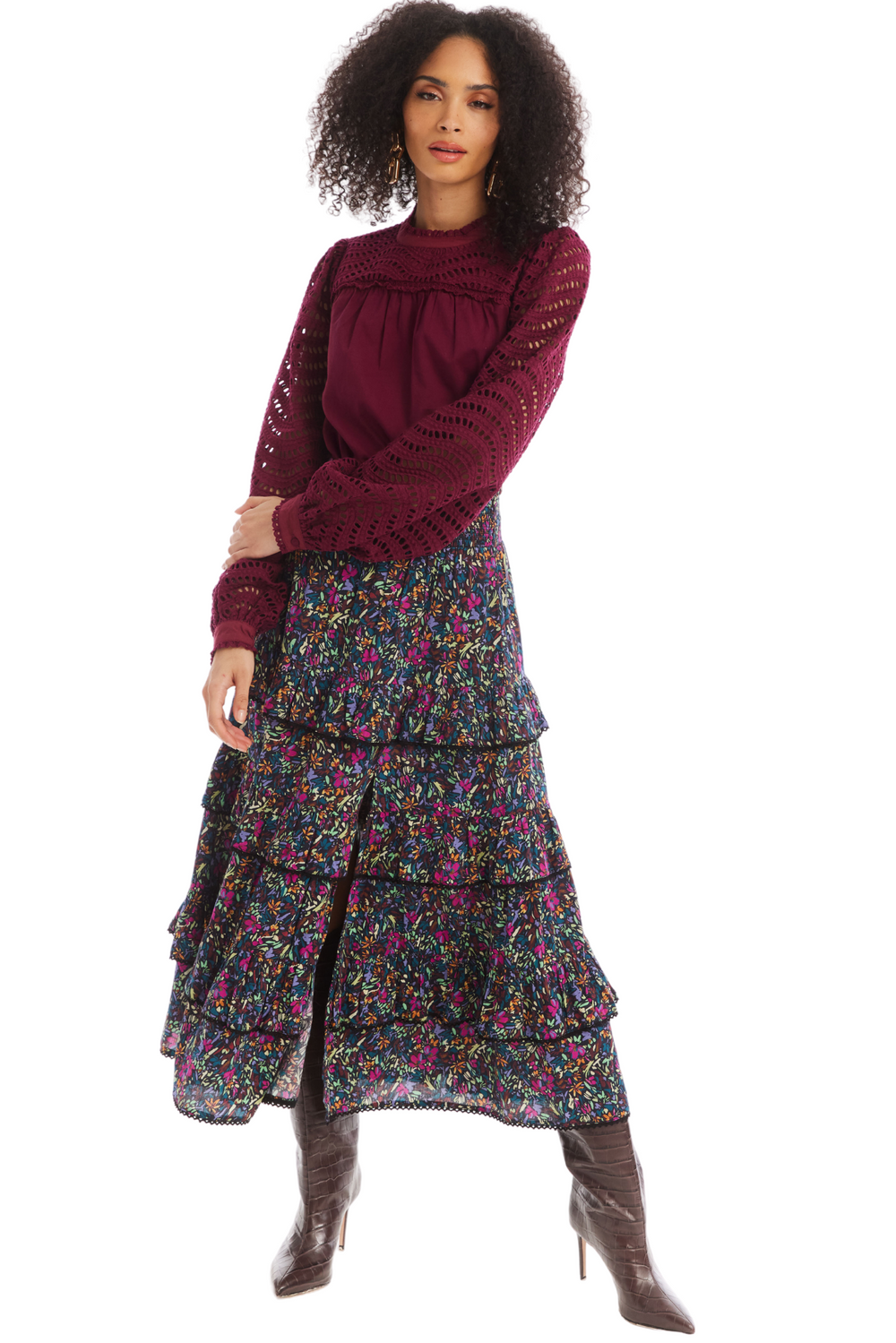 The Nadia Blouse is designed with contrasting embroidered eyelet at the yoke and sleeves, leading to a soft cotton body. Cut with a high neckline adorned with lace trim and a button cuffed long sleeve. Back keyhole and button closure at neck. Top yoke and sleeves are semi-sheer and unlined.
