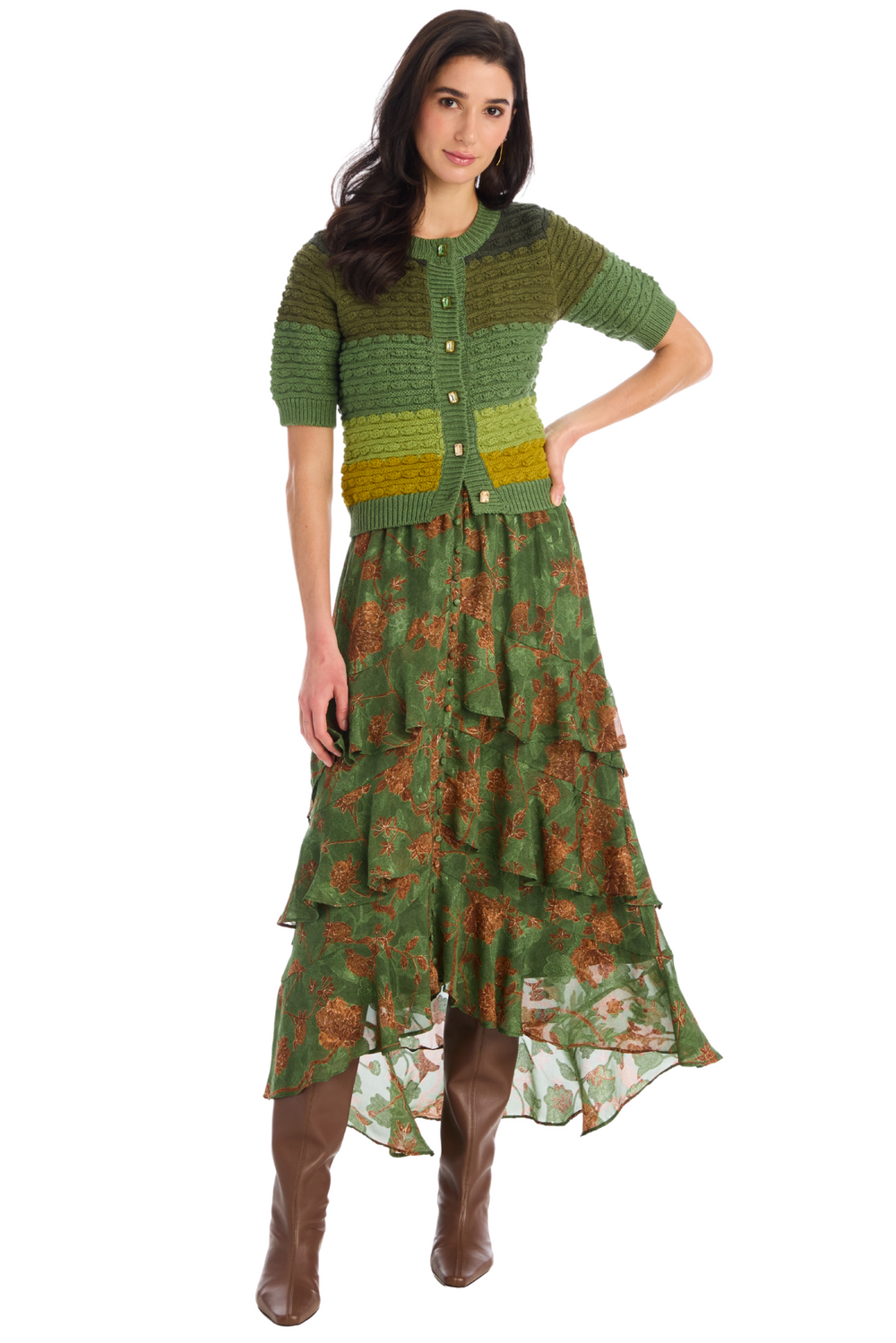 Back by popular demand in a short sleeve style: The Adelle Cardigan. Designed in our most-loved bubble knit technique featuring an ombre color story and rhinestones buttons. Slightly cropped and fitted through the body. Working buttons allow you to style this cardigan open or closed.